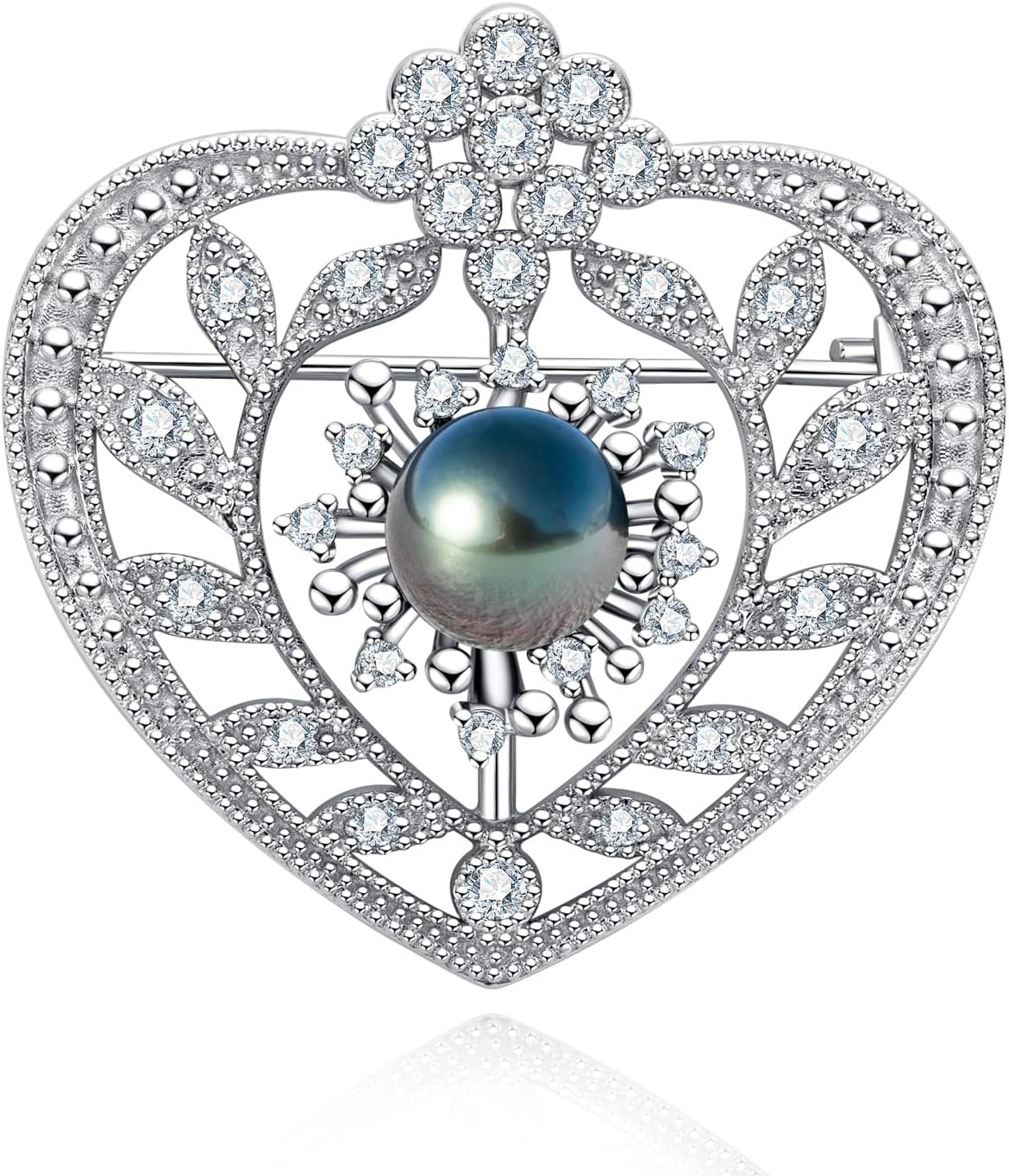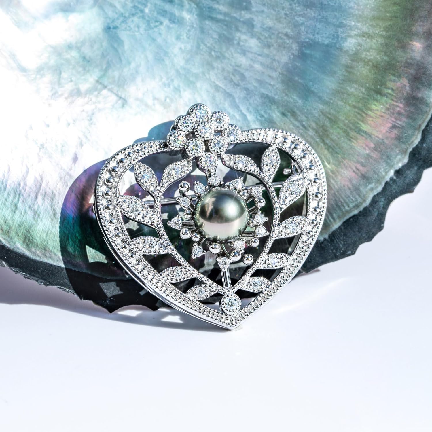 - A gorgeous 2 in 1 pendant brooch featuring a heart-shaped design adorned with dazzling round moissanites, creating brilliance and sophistication. A central Tahitian black pearl adds a touch of grace. Versatile and chic, this brooch can be effortlessly transformed into a pendant. Whether worn as a brooch or pendant, its timeless elegance shines through.