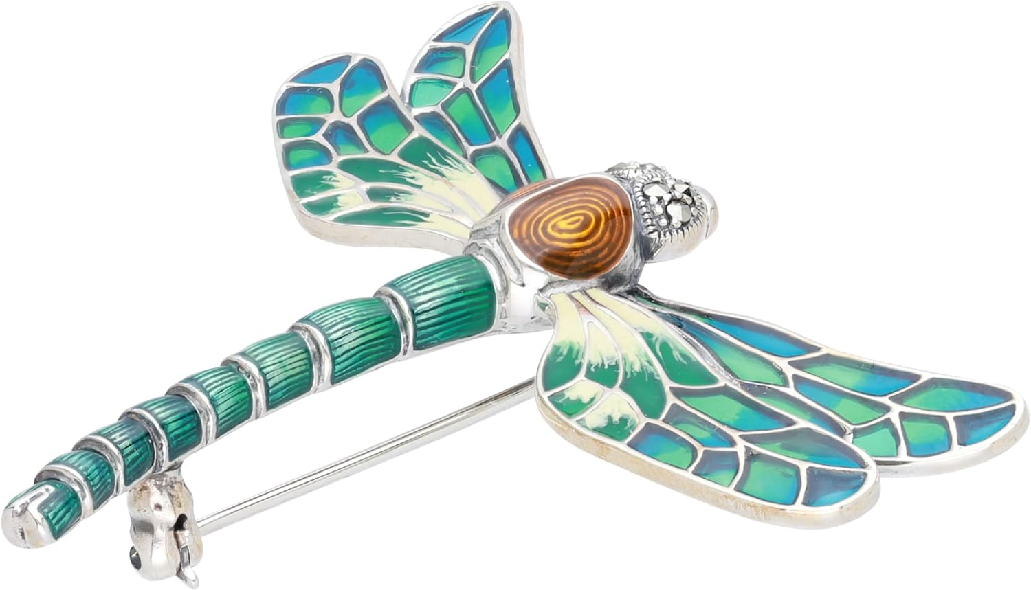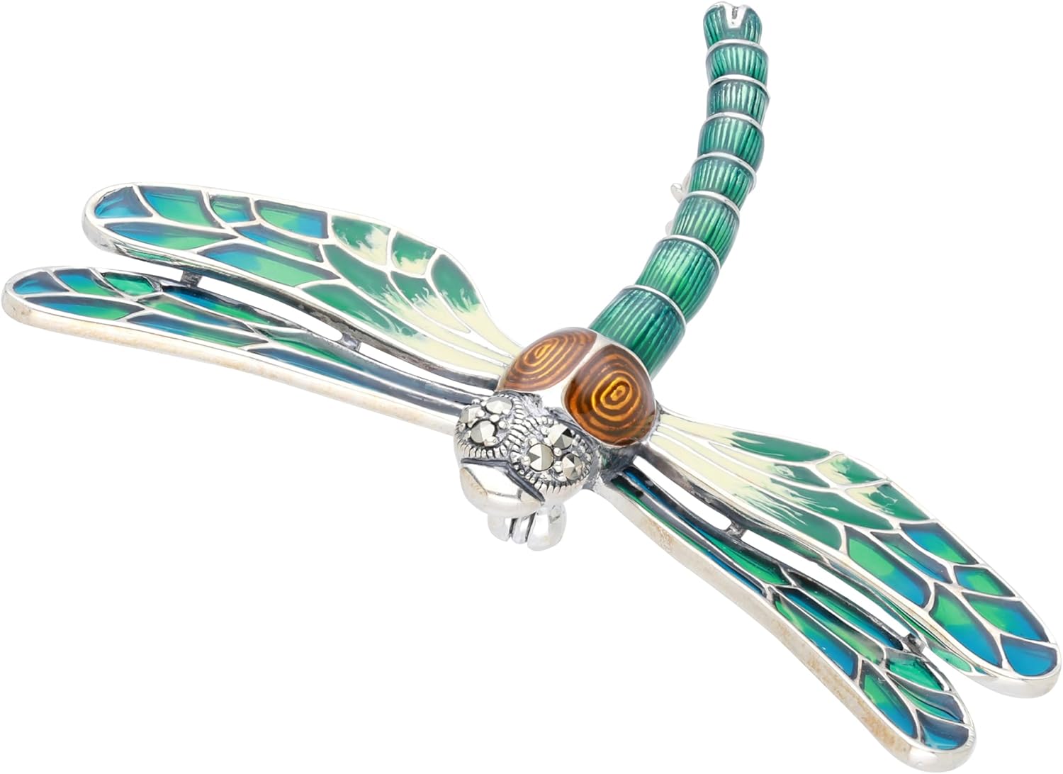 • This colorful and intricately designed dragonfly brooch is made of 925 sterling silver with green and blue enamel and features round cut marcasite gemstones.