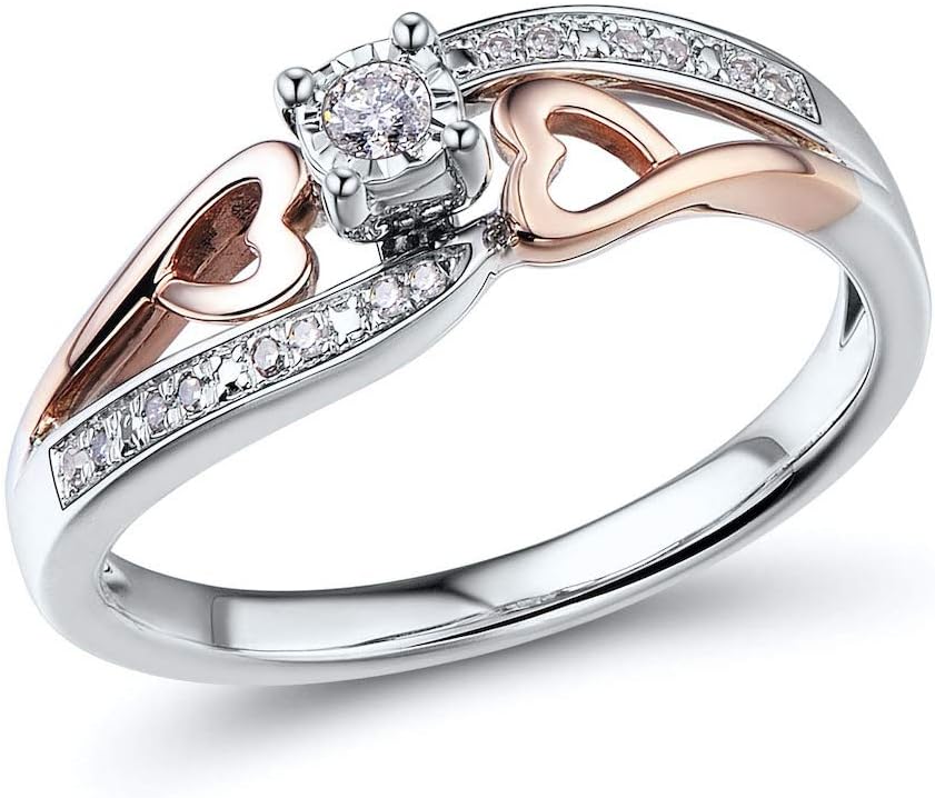 - Precious Metal – This 10k Rose Gold and Sterling Silver Diamond Promise Ring is designed with two 10k Rose Gold hearts on either side of the center diamond creating just the right feminine touch. The ring is stamped 925 and 10k to indicate the purity of the metal. The Sterling Silver is finished with Rhodium Plating to diminish tarnishing and scratching and provide a high polish finish.