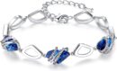 - Bracelet charms each measures 0.5″ x 0.5″; Lobser claw clasp; Chain length is 7″ +2″ extender; Galatic crystal, sapphire blue; Flatback zirconia rhinestones, crystal AB color; Rhodium plating
